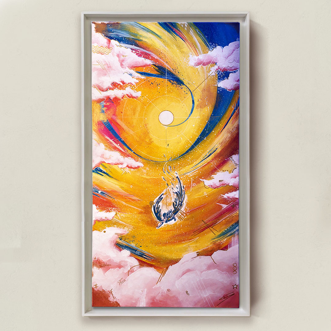 Les couleurs vibrantes dominées par un jaune intense mêlé à des touches dorées symbolisent la lumière, l’origine et le sacré. Elles enveloppent un personnage en chute libre, semblant descendre du ciel, métaphore de l’âme quittant l’infini pour rejoindre le monde terrestre, représentant le secret pour entrer dans sa destinée.